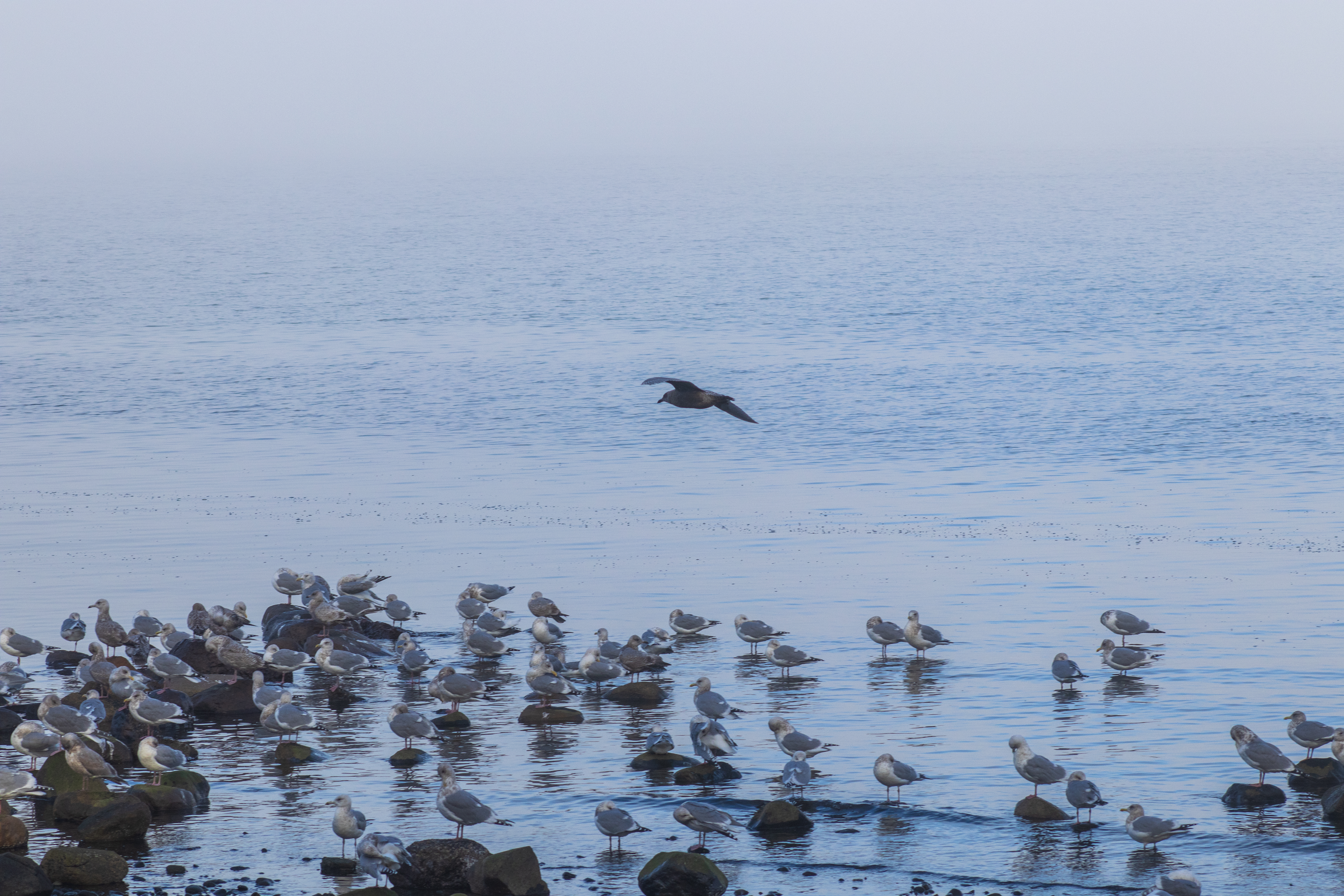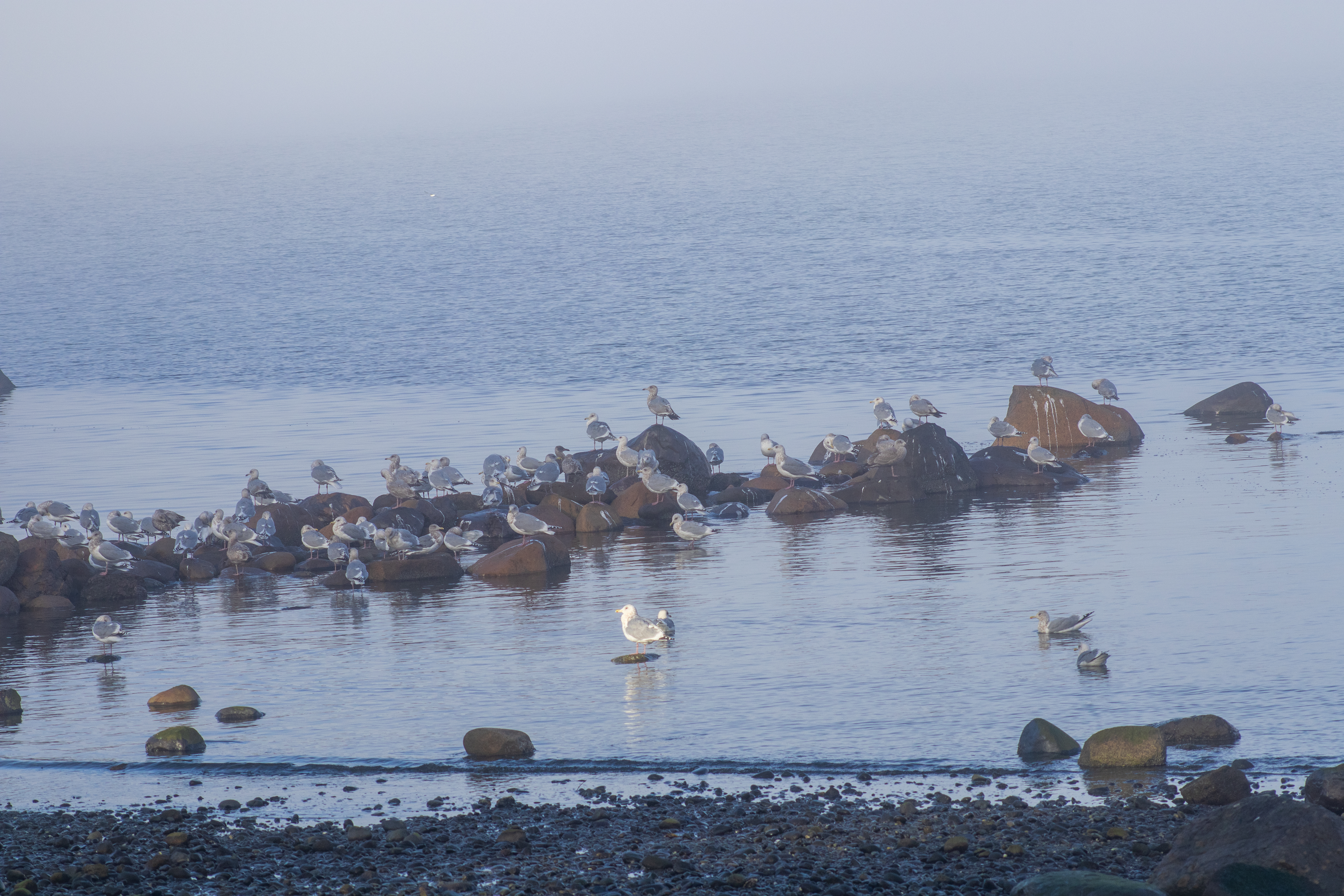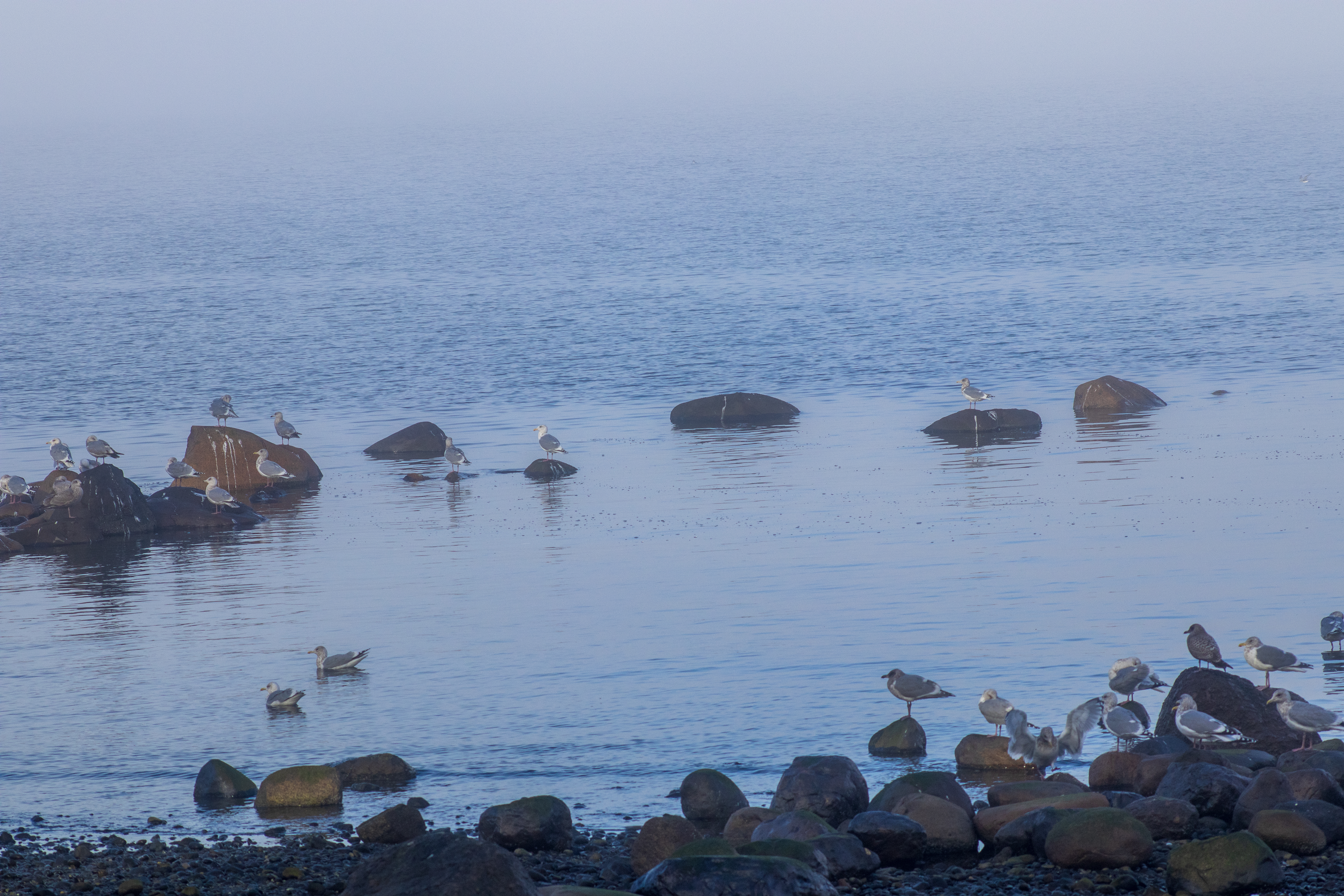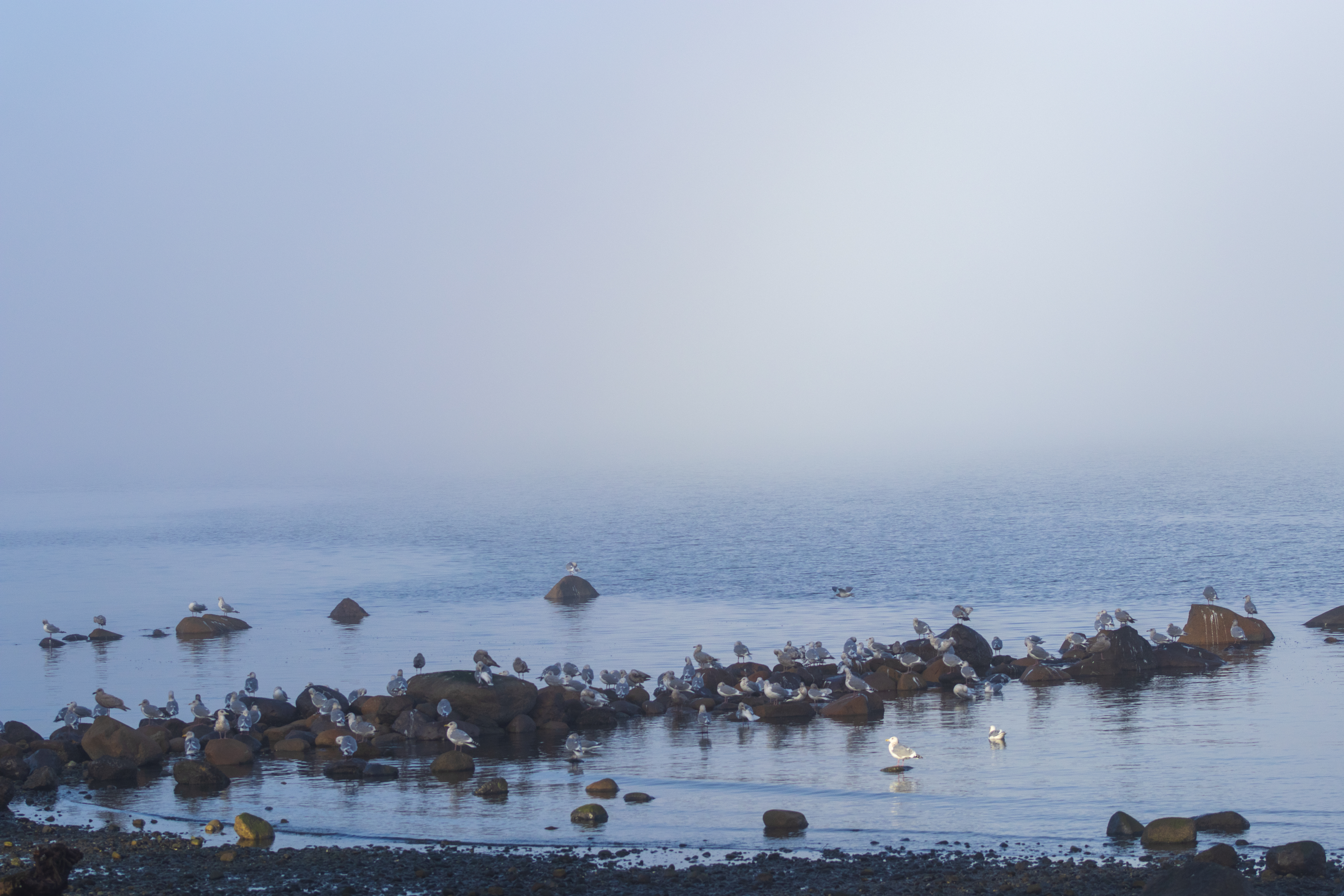 The pockets of fog along the coast created an ethereal, filmy atmosphere. The seagulls congregated close to the shoreline on the round rocks poking out of the water.