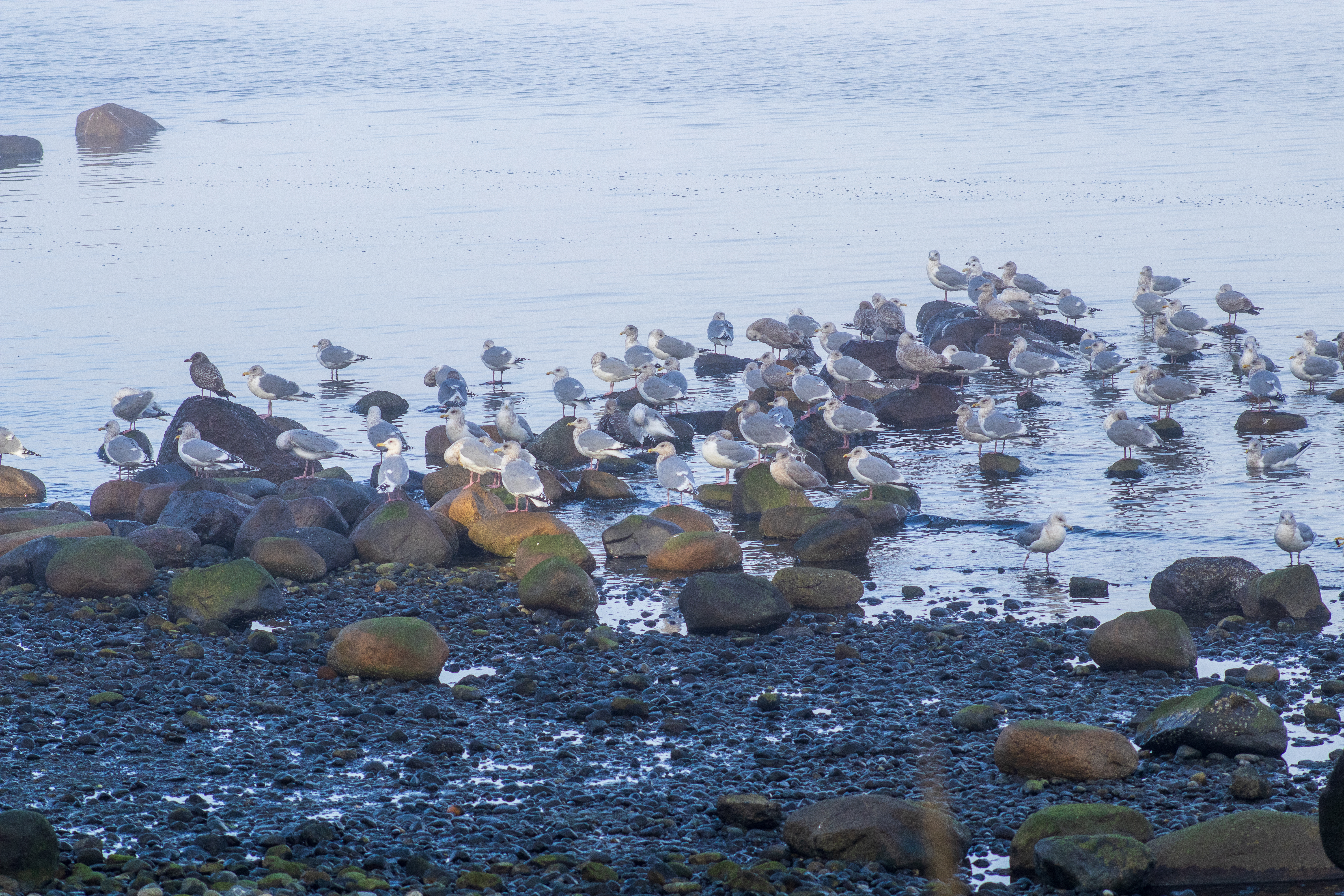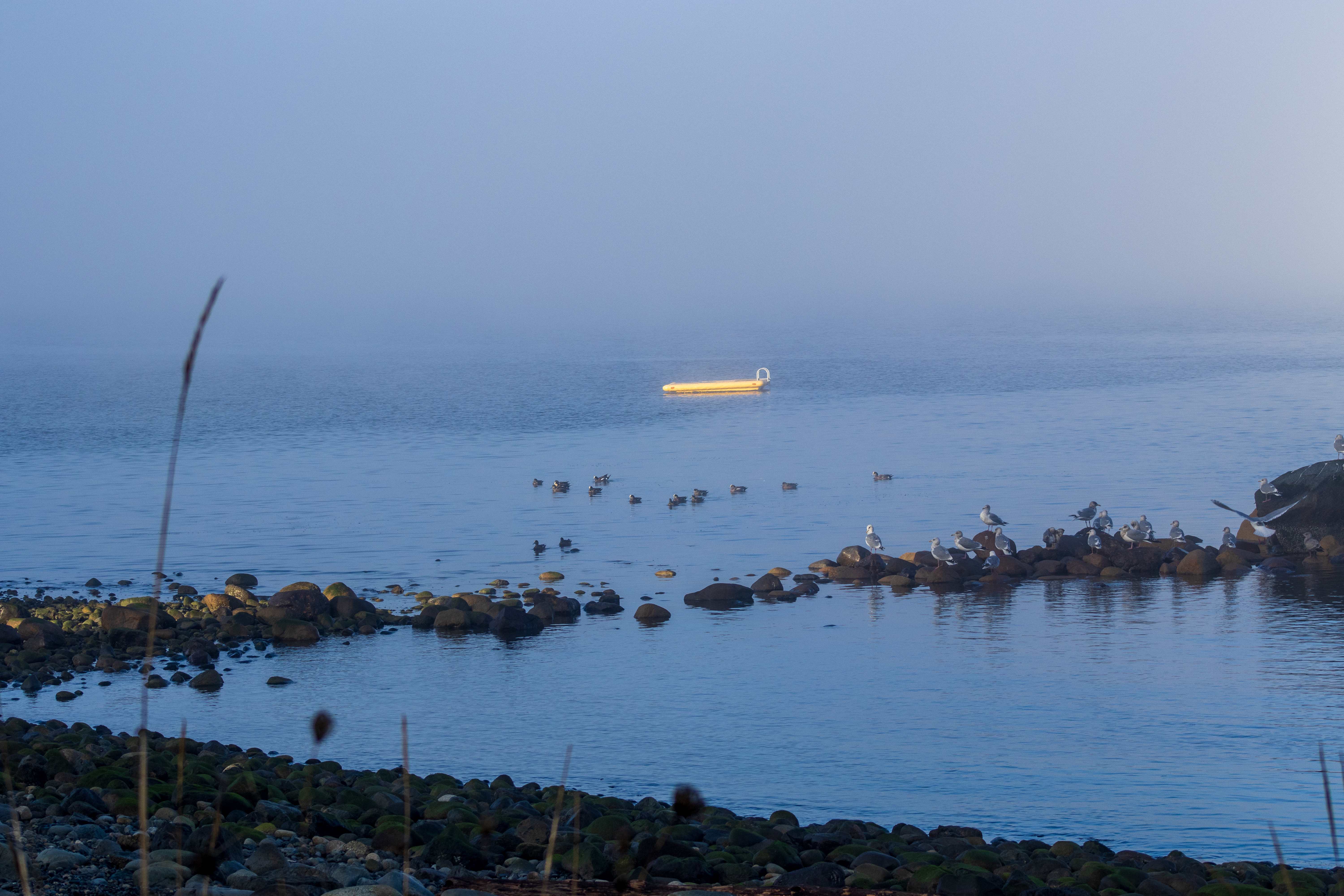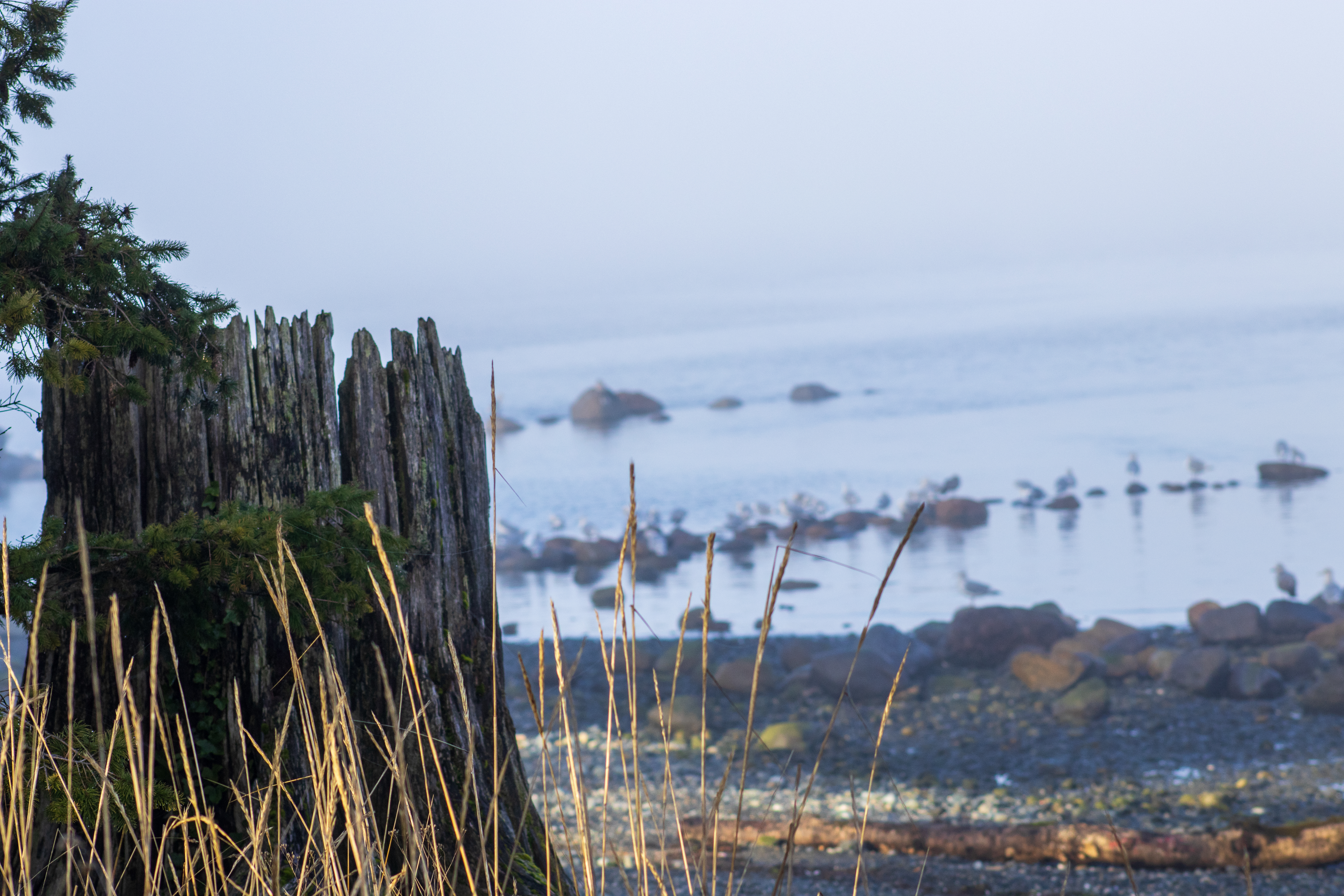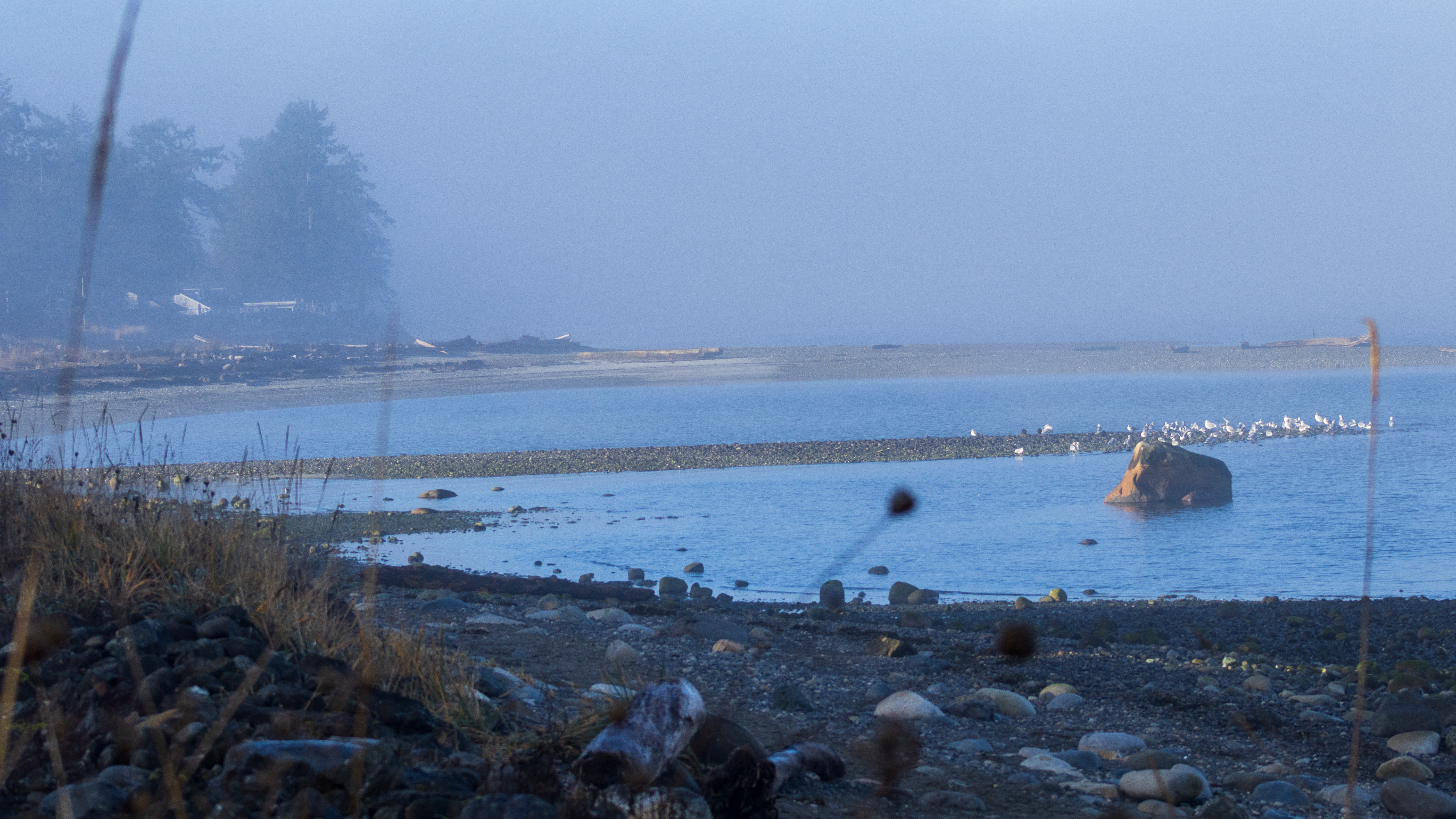 The pockets of fog along the coast created an ethereal, filmy atmosphere. The seagulls congregated close to the shoreline on the round rocks poking out of the water.