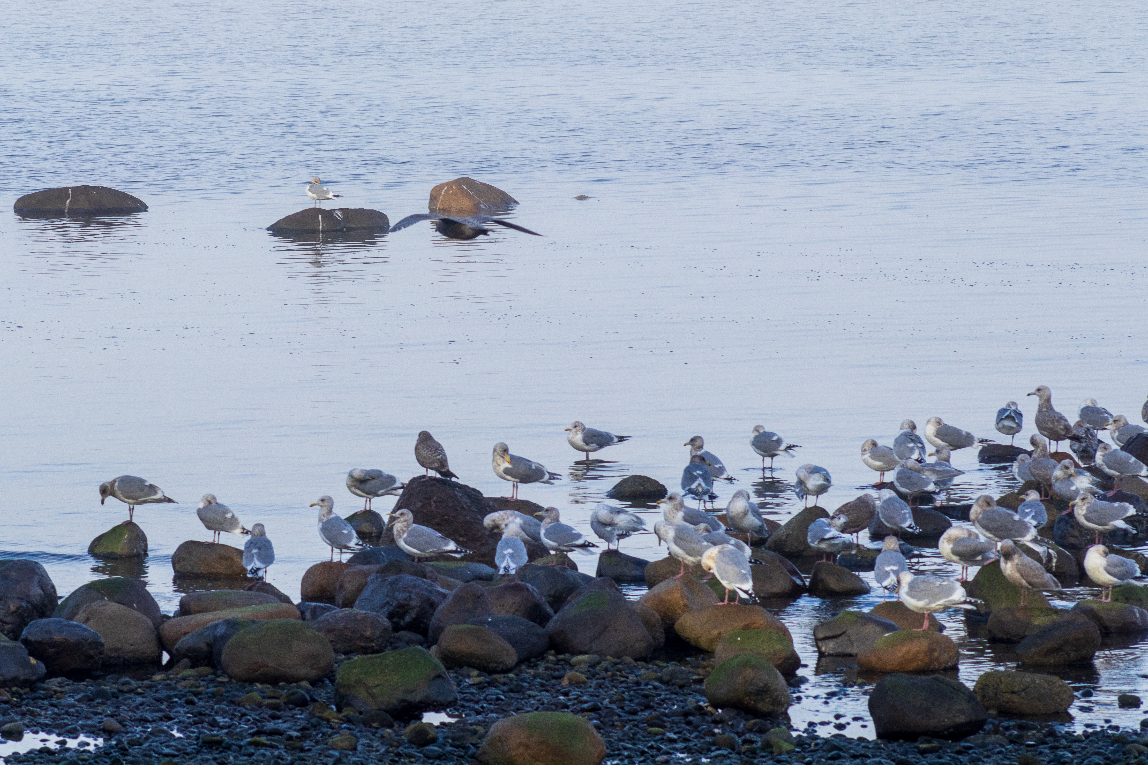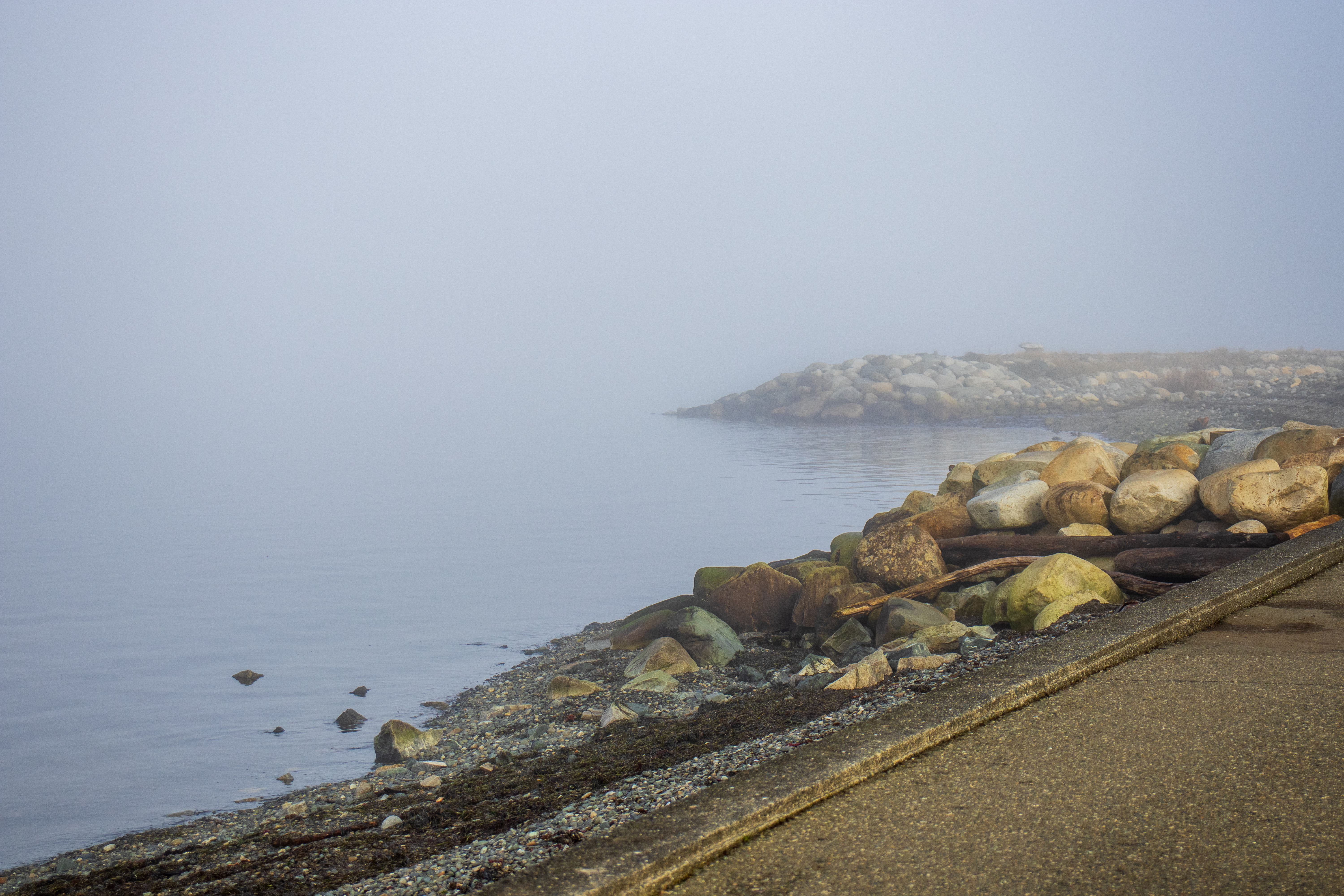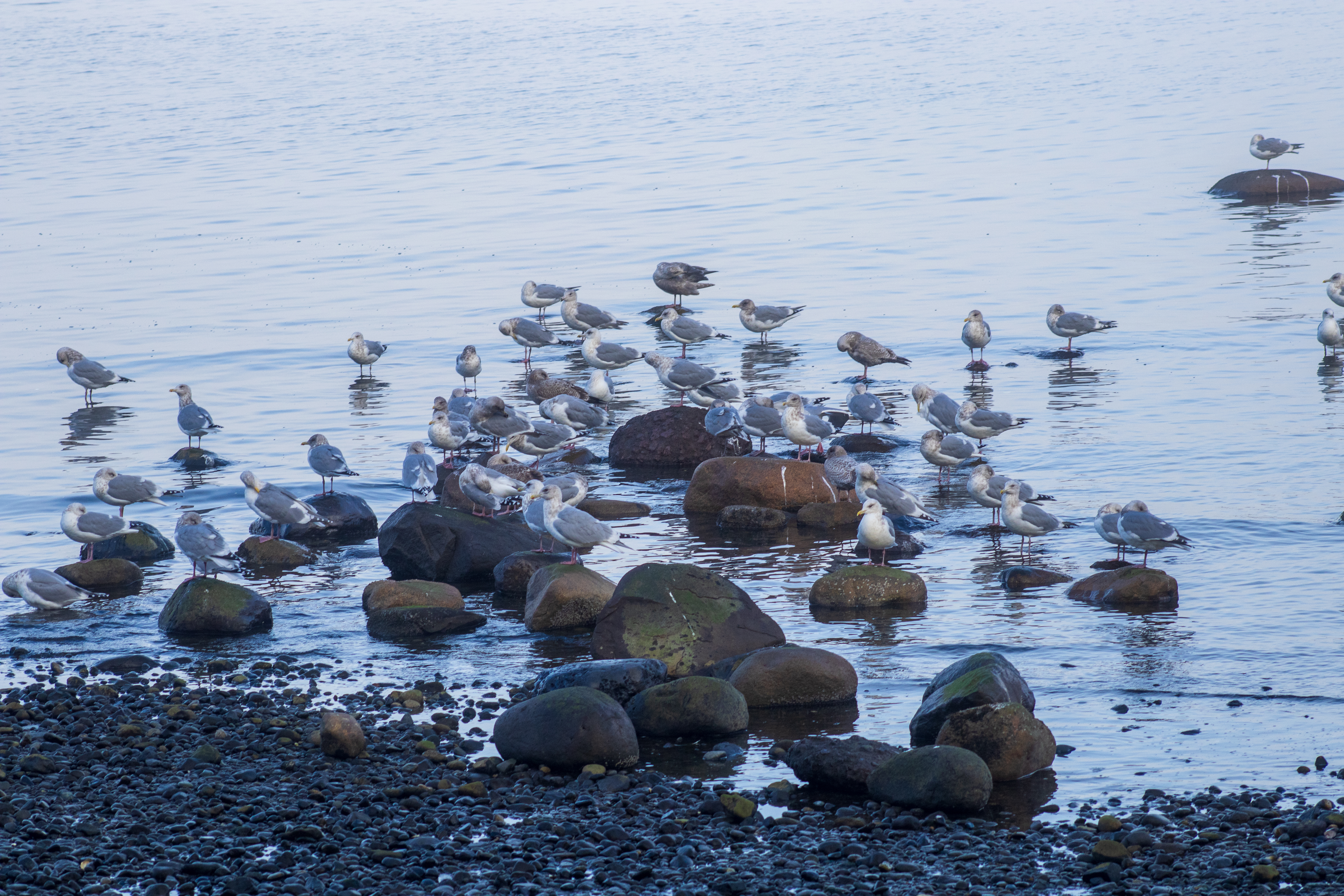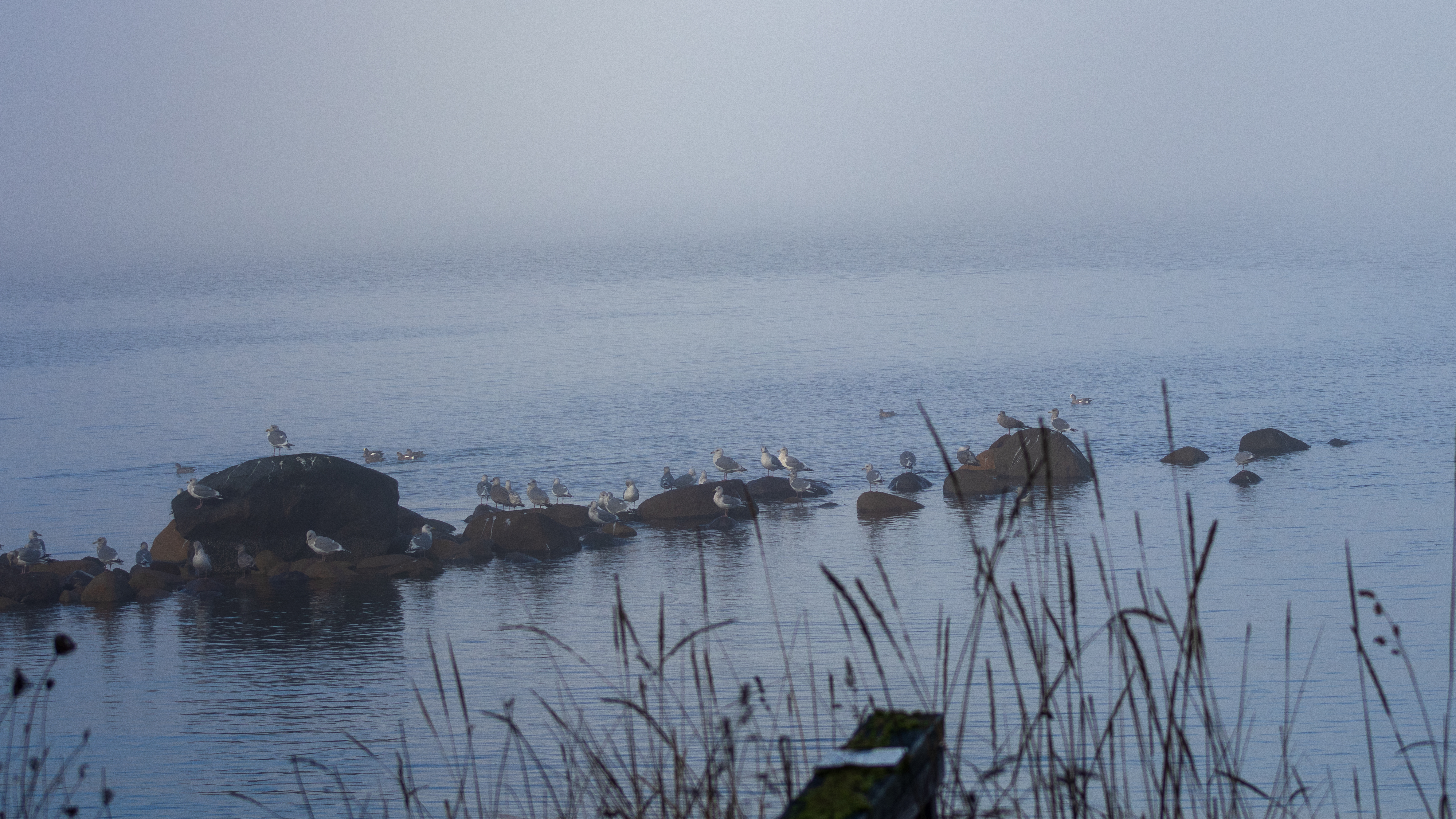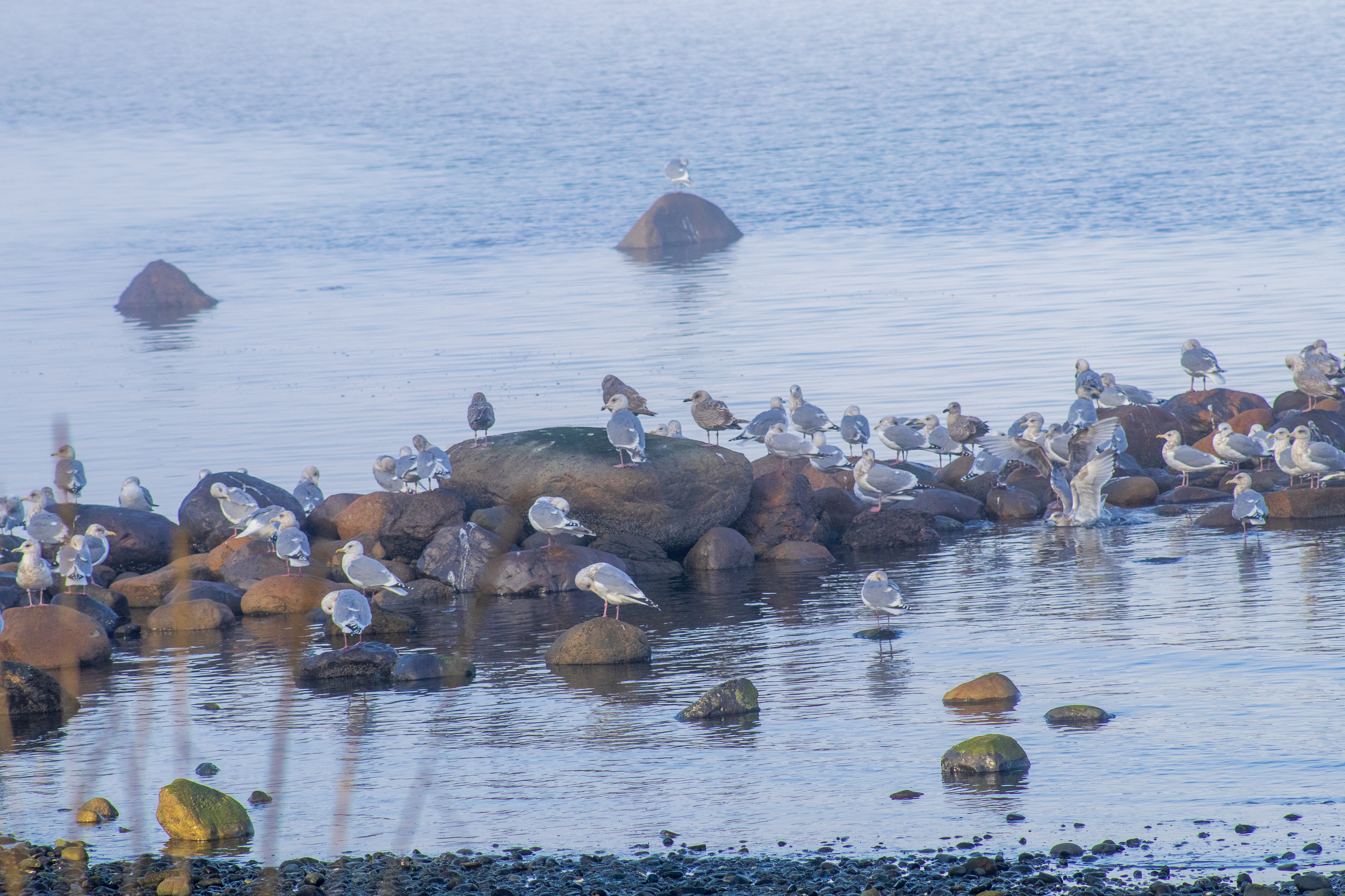 The pockets of fog along the coast created an ethereal, filmy atmosphere. The seagulls congregated close to the shoreline on the round rocks poking out of the water.