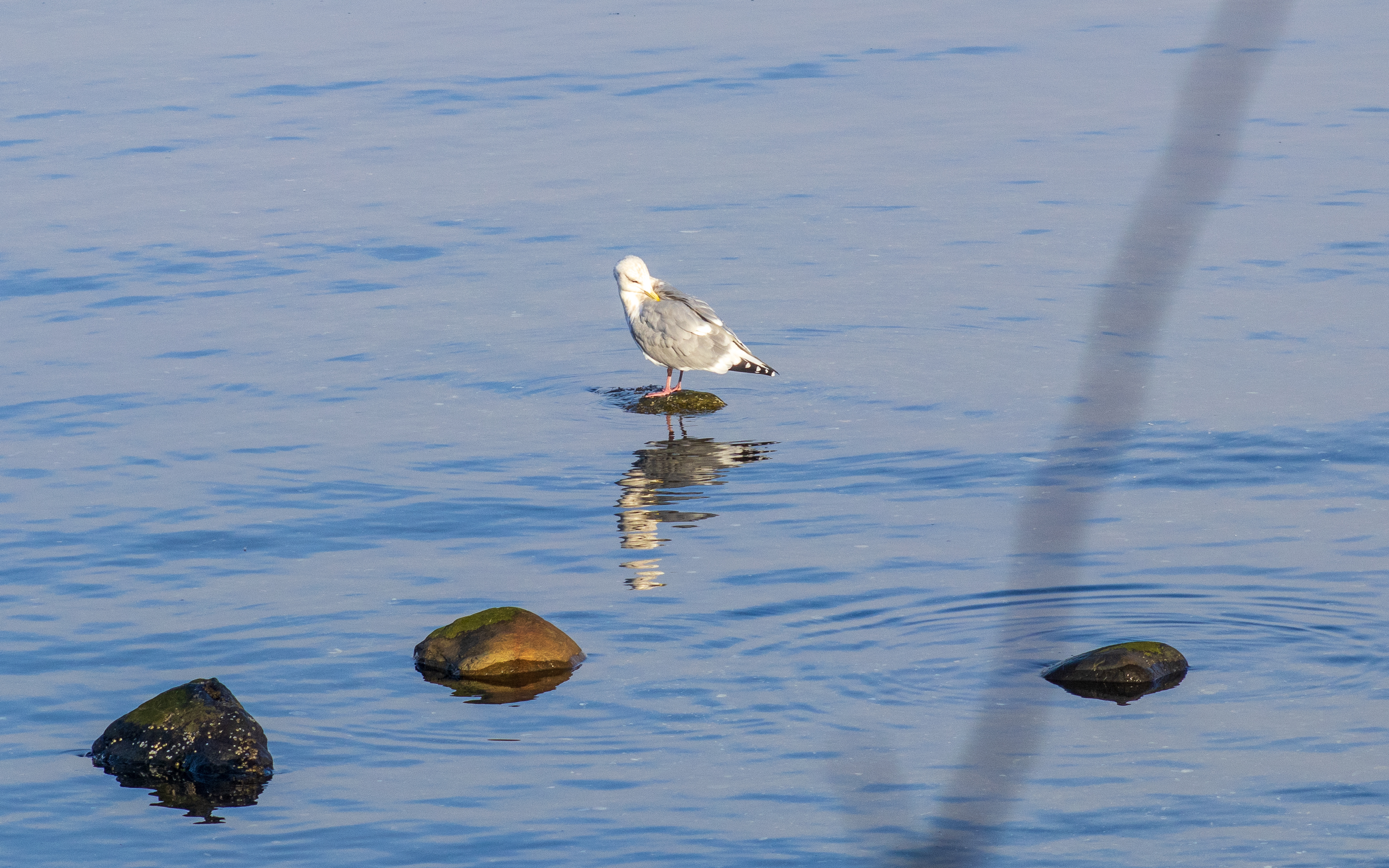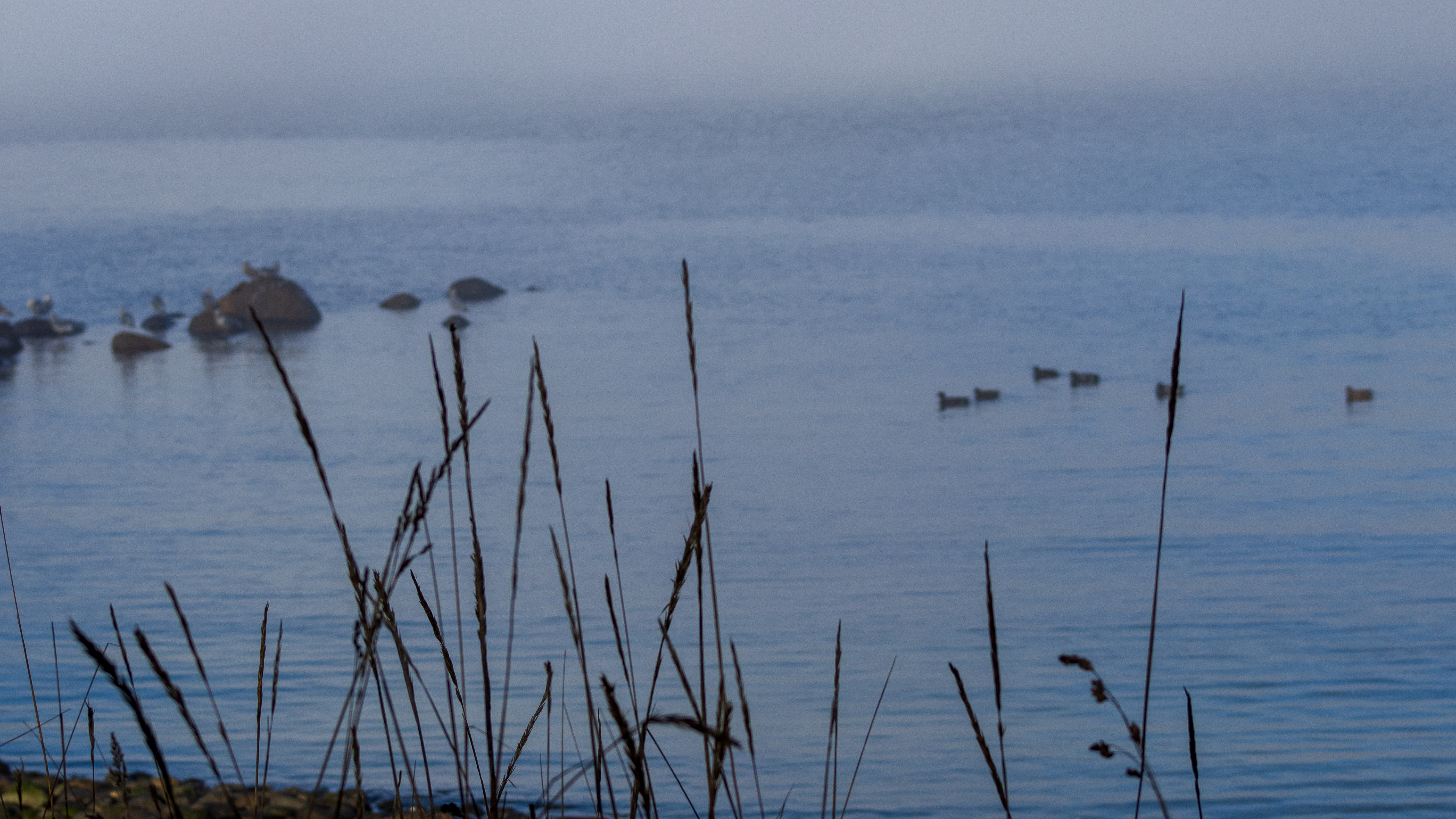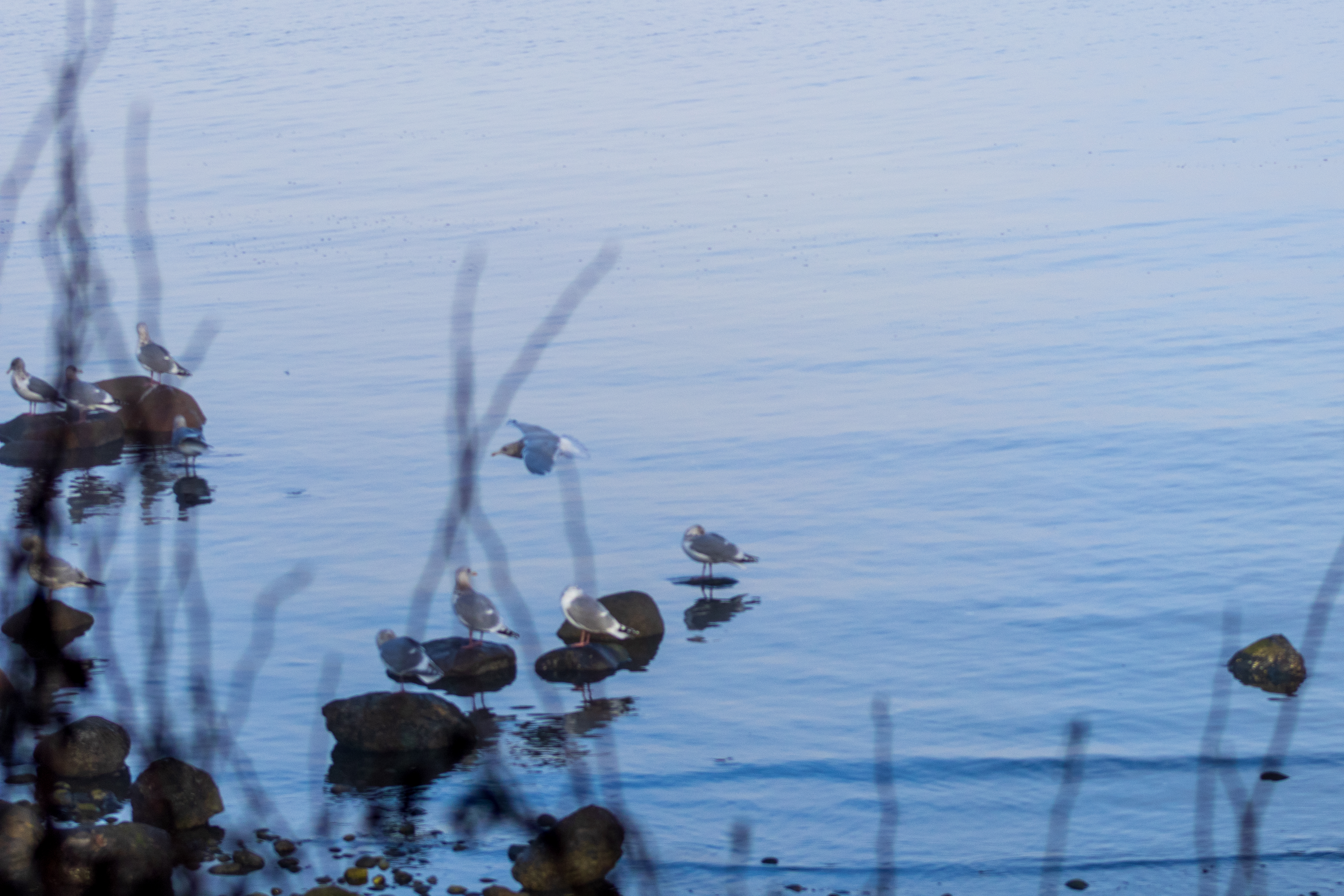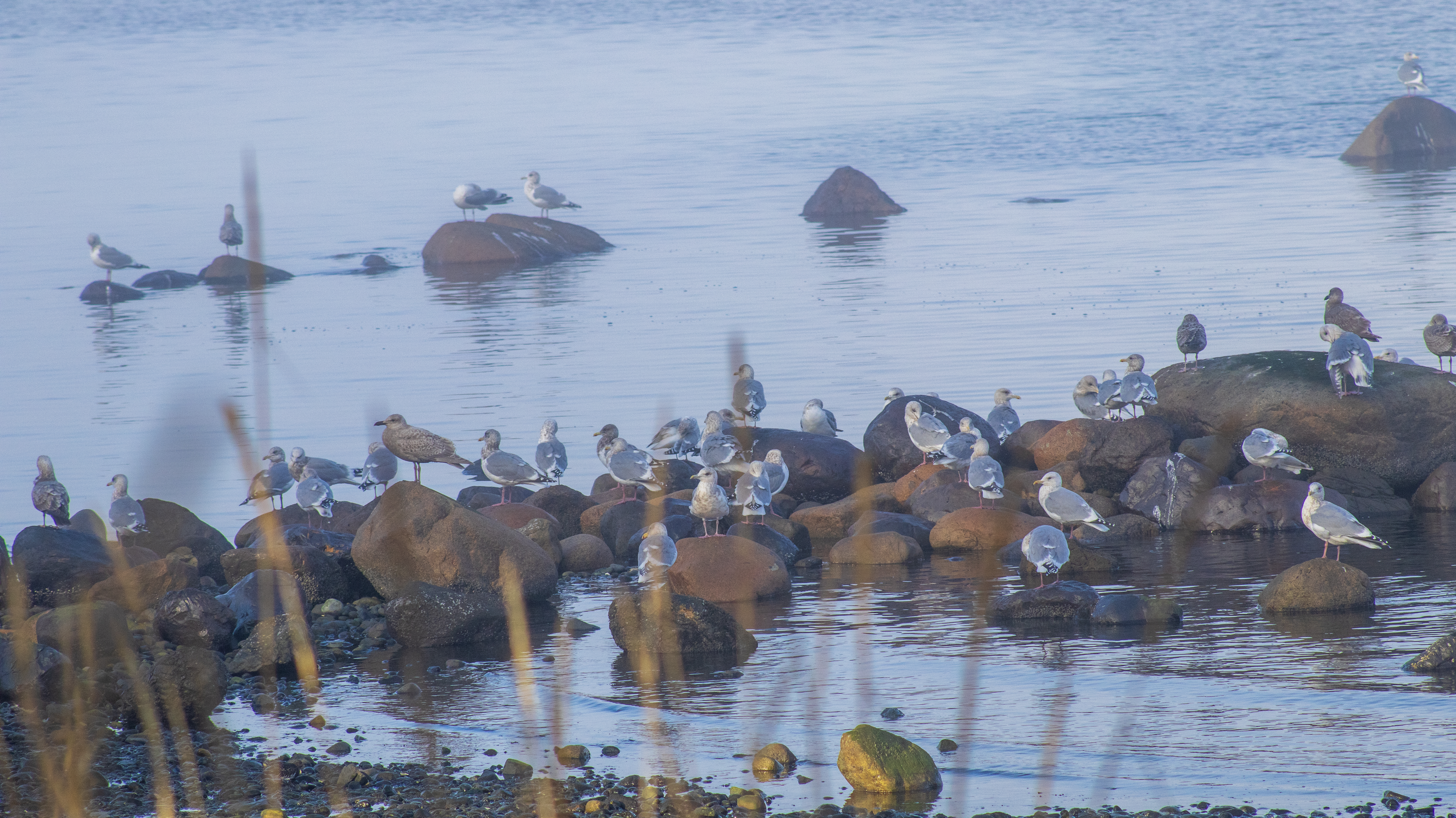 The pockets of fog along the coast created an ethereal, filmy atmosphere. The seagulls congregated close to the shoreline on the round rocks poking out of the water.